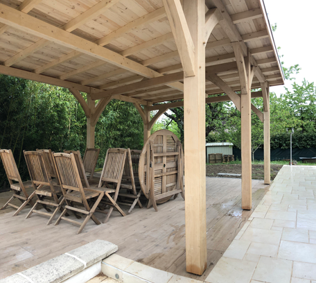 Création d'un abri de jardin en chêne sur la commune de Valleiry. Couverture en bacacier pour limiter la pente.